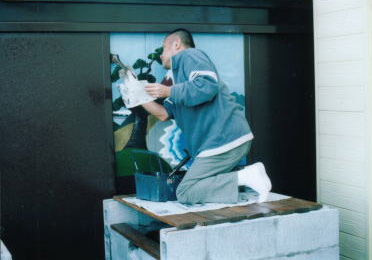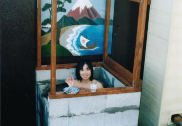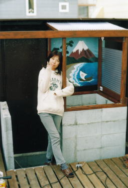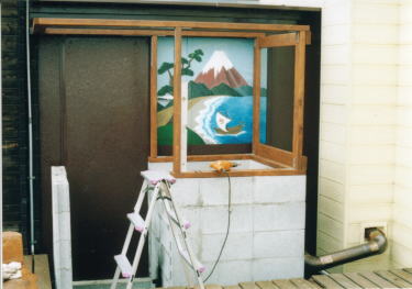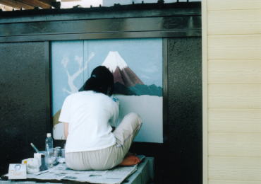 風呂の背景は、やっぱり富士山!北斎風にしようと頑張るレイコ画伯。